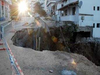 Çöken alan güvenlik şeridiyle kapatıldı. Araçlar